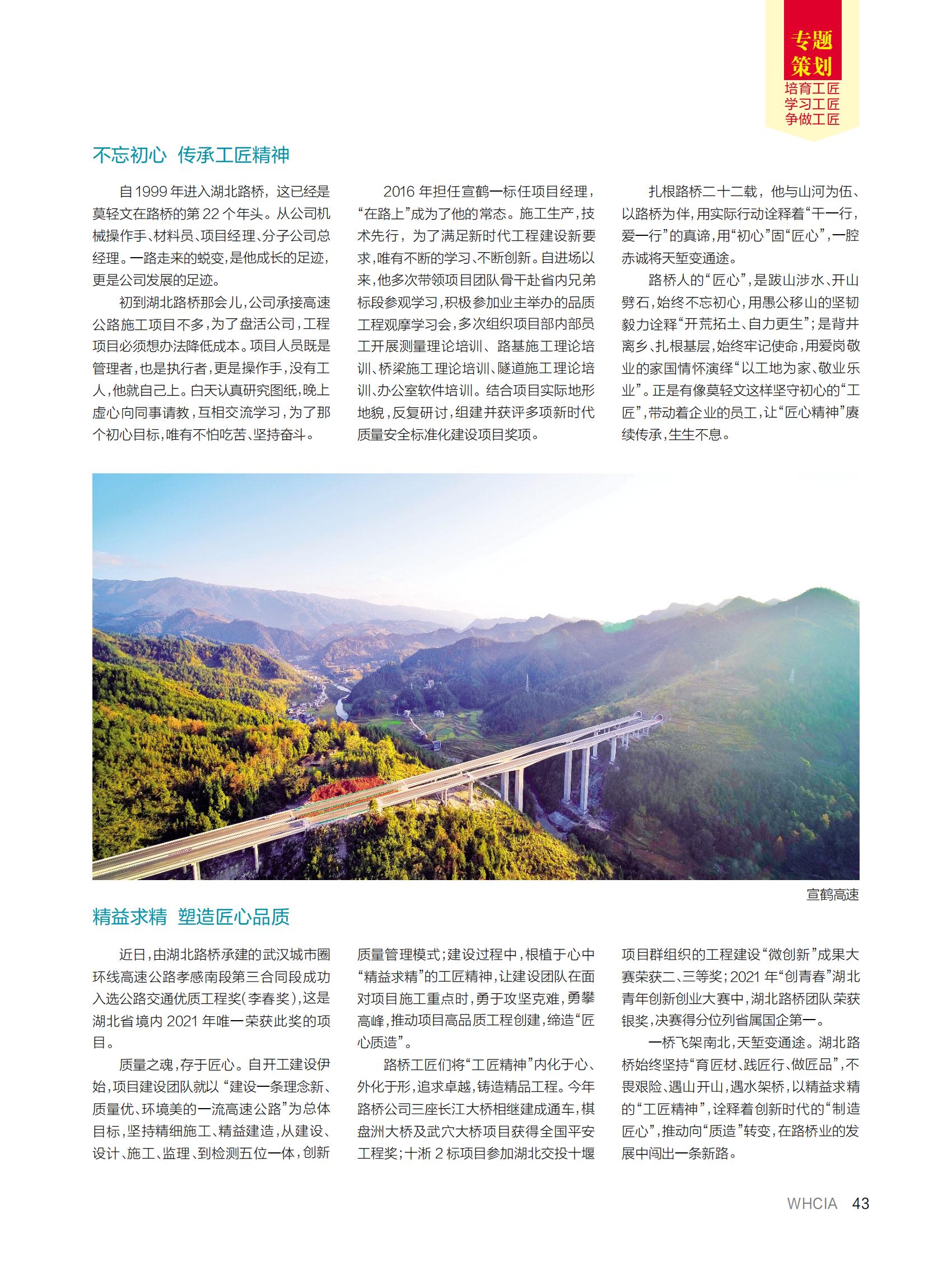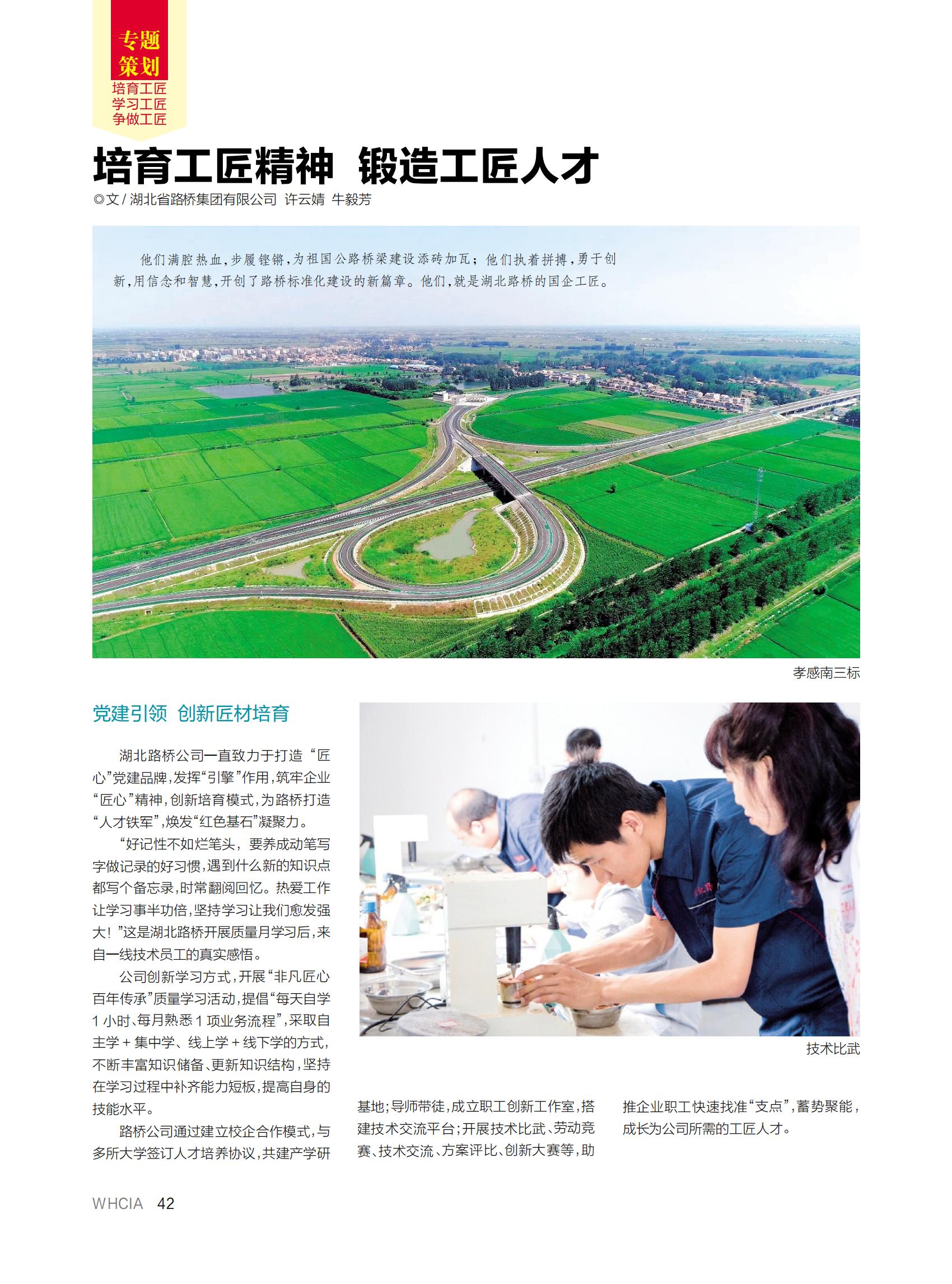 近日,湖北路橋撰寫的《培育工匠精神 鍛造工匠人才》一文,登上武漢建筑業協會主辦的《武漢建筑業》雜志“工匠精神”專題策劃版,以下為全文: