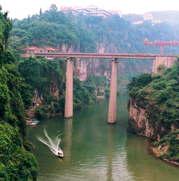 宜昌下牢溪大橋位于風光秀麗的宜昌三游洞風景區。該橋飛跨陡崖,拔地而起,橢圓型墩柱高達63米,1972年建成