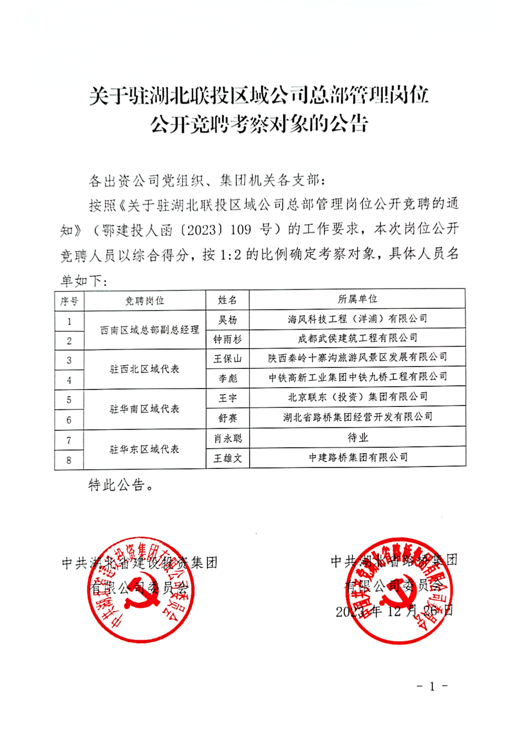 關于駐湖北聯投區域公司總部管理崗位公開競聘考察對象的公告