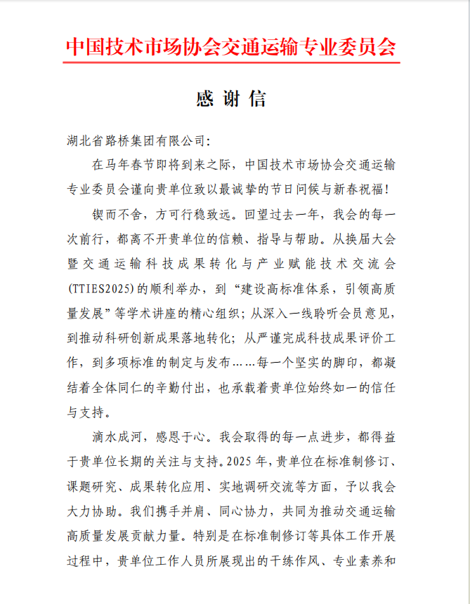 近日,湖北路橋收到中國技術(shù)市場協(xié)會交通運輸專業(yè)委員會(簡稱“中技協(xié)交專委會”)寄來的感謝信,對公司科學(xué)技術(shù)質(zhì)量部在各項工作中的大力支持表示感謝。