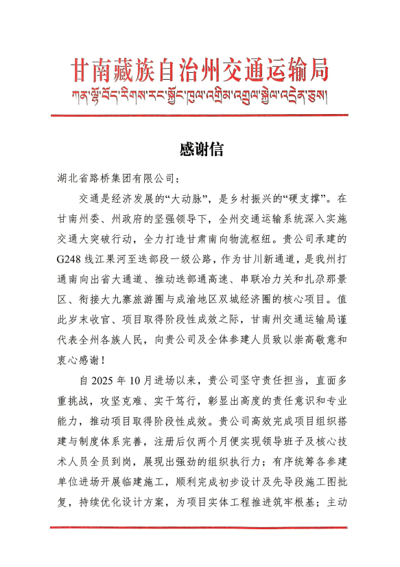 甘南藏族自治州交通運輸局近日發(fā)來感謝信,對湖北路橋承建的G248線江果河至迭部段一級公路項目取得的階段性成效給予高度肯定與誠摯贊譽。