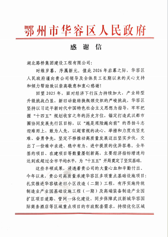 鄂州市華容區(qū)人民政府發(fā)來感謝信,對湖北省路橋建設(shè)工程有限公司承建的華容區(qū)多項重點基礎(chǔ)設(shè)施項目的高質(zhì)量推進給予高度肯定與誠摯贊譽。