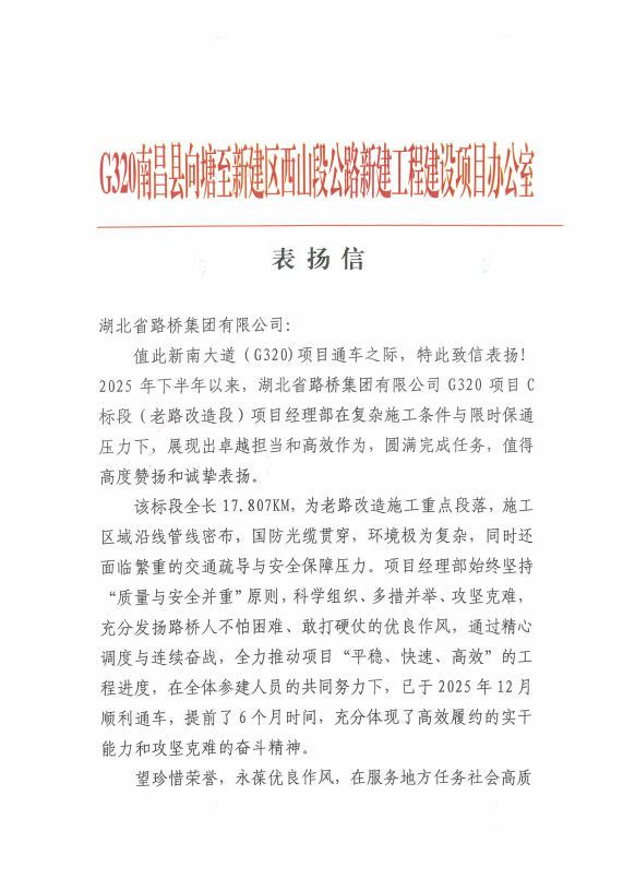 G320南昌縣向塘至新建區(qū)西山段公路新建工程C標(biāo)段(老路改造段)項目收到一封來自南昌市公路事業(yè)發(fā)展中心的表揚信,對項目團隊在復(fù)雜施工環(huán)境與嚴(yán)格的限時保通雙重壓力之下,提前6個月完成建設(shè)任務(wù)的非凡勇氣、務(wù)實作為與堅韌擔(dān)當(dāng),給予了高度評價與贊美。