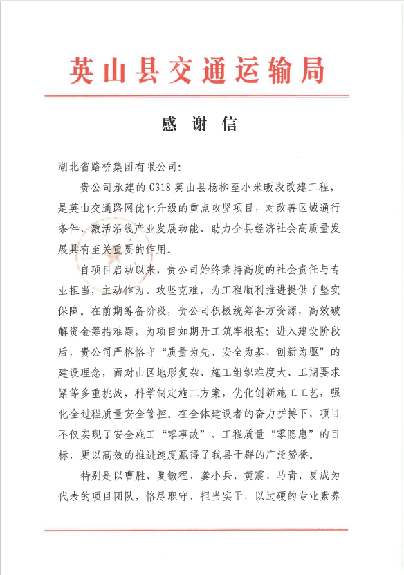 英山縣交通運輸局對湖北路橋承建的G318英山楊柳至小米畈段改建工程給予高度贊譽。